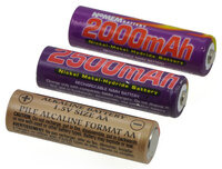 - Lithium-based rechargeable batteries have around double the energy density of alkaline and NiMH batteries by volume and even better improvements by weight. These newer batteries are far less standardized in terms of battery size and shape, but since they are usually intended for applications where capacity or maximum battery life are important, these batteries usually have their voltages and capacities prominently labeled.